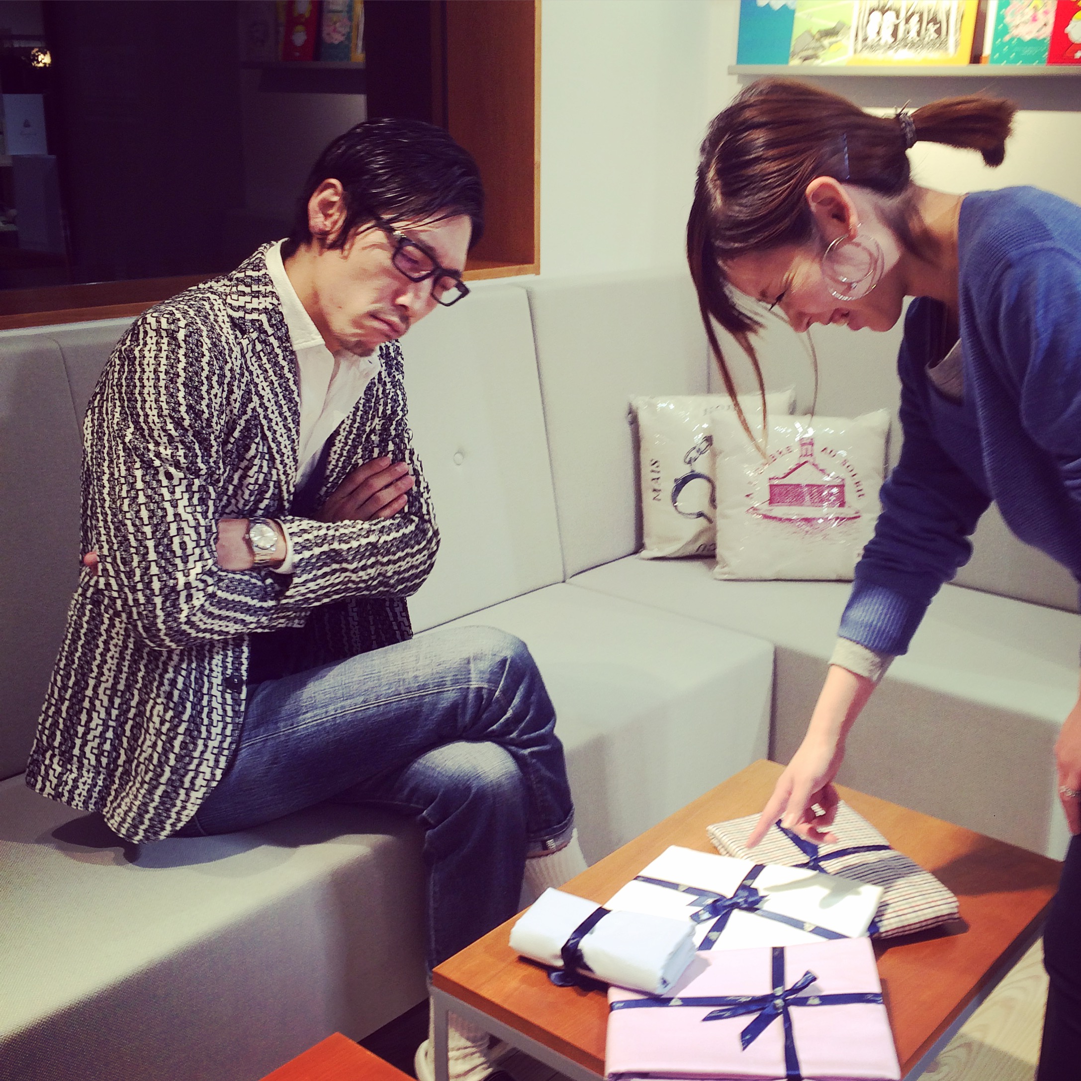 "オーダー会場左手のソファーで生地広げちゃって下さい!!"