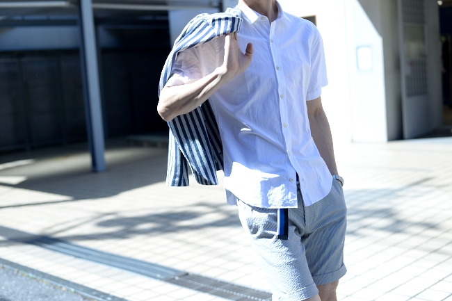 柄物ジャケットには鉄板のフィナモレの白シャツ(モチロン半袖!!)