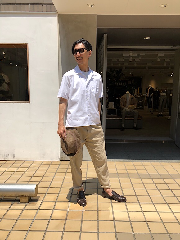 こちらはアメカジ好きのサトさんが満を持して開襟シャツのスタイリングを組んでくれました!