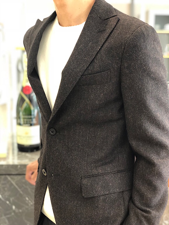 コチラのディテールは、2つ釦・シングルジャケット・ピークドラペル・チェンジポケット付きとなっており、クラシックな印象とイタリア仕立てのバランスがとても良いモデルとなっております。